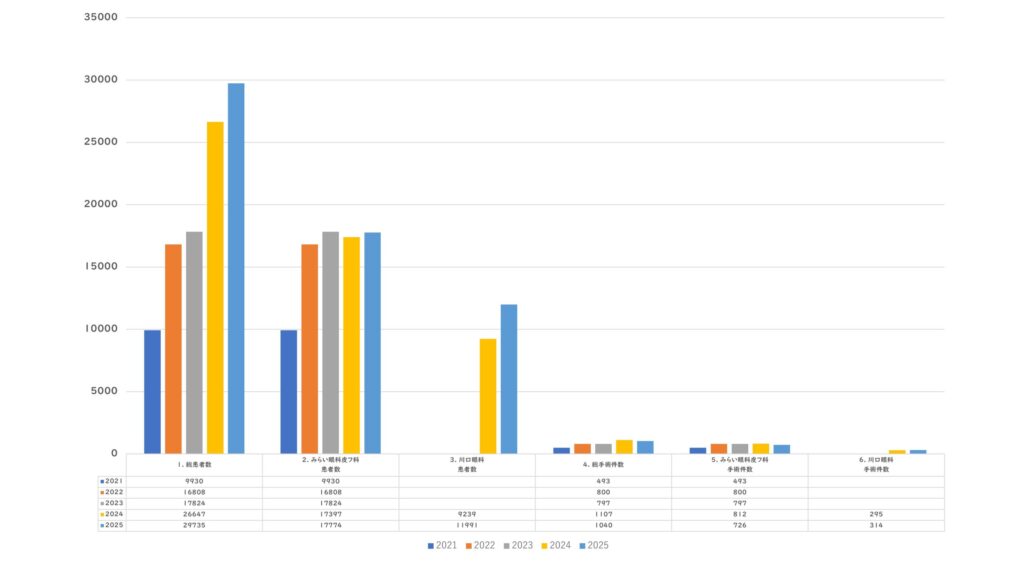 外来延患者総数は2025年1月~12月まで(12か月間)で、29735人(みらい眼科皮フ科17774、川口眼科11991)でした。